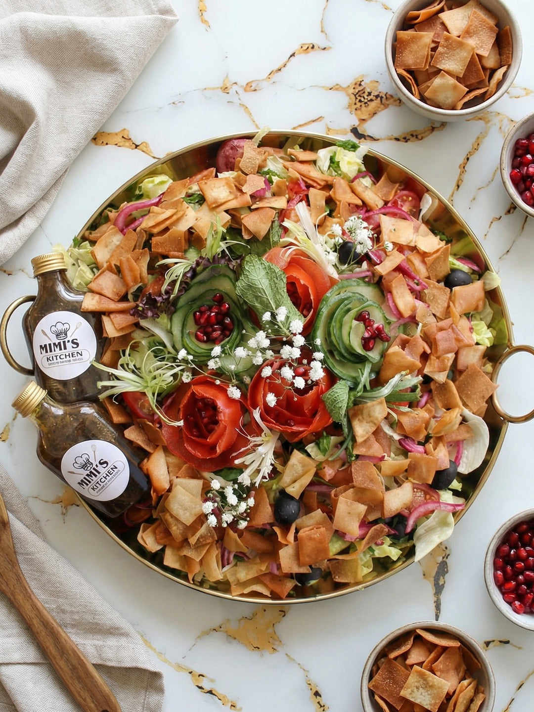 Salad consisting of various vegetables, dressed with lemon dressing and fried pita bread