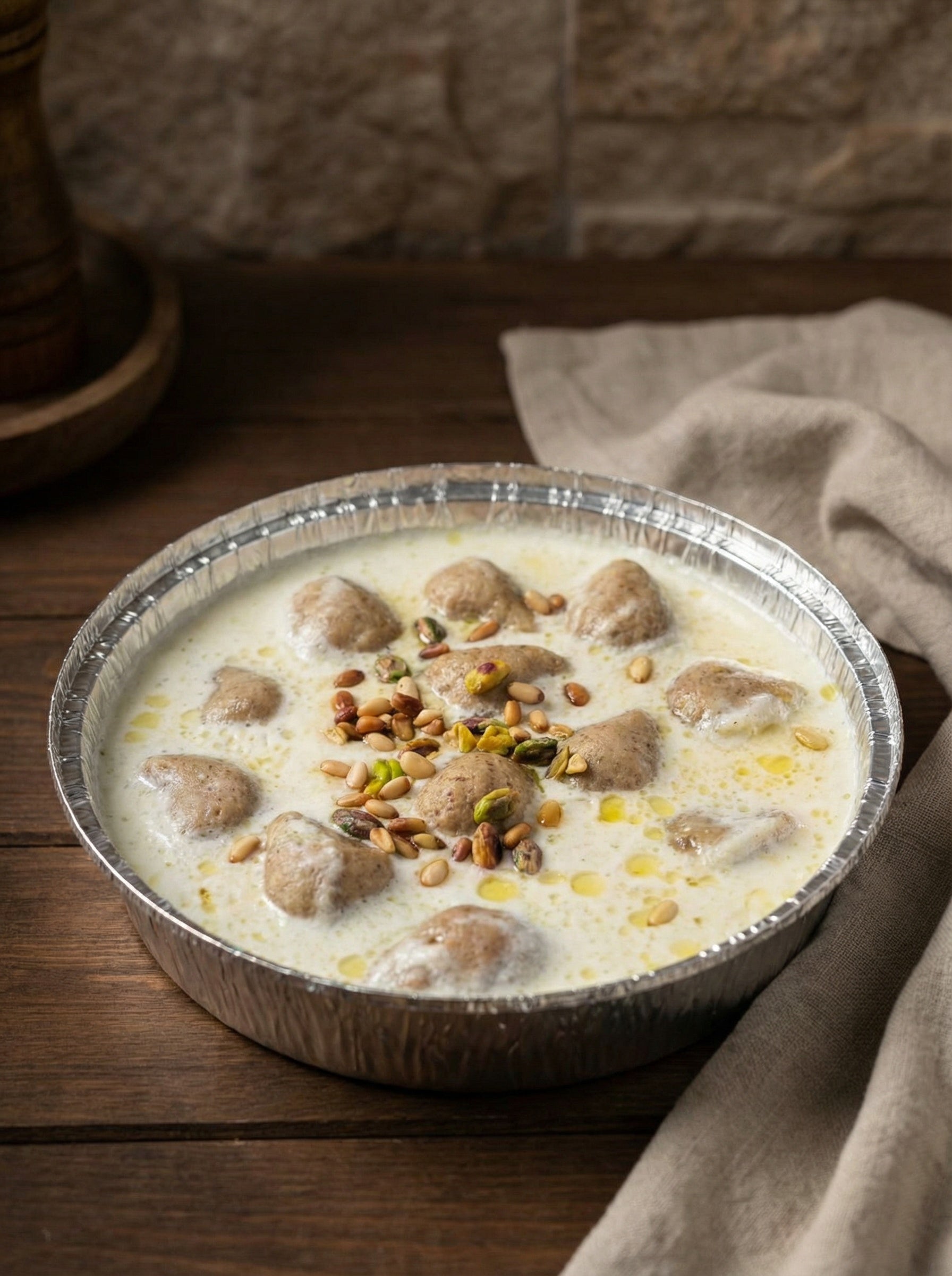 Bulgur dough filled with meat and onions in a bath of warm yogurt